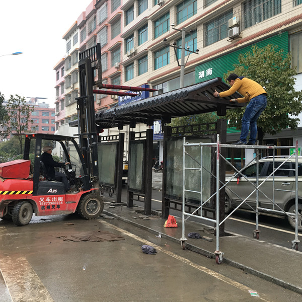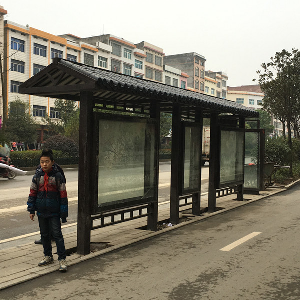湖南仿古公交候车亭下雨、晚上火热安装现场实物图: